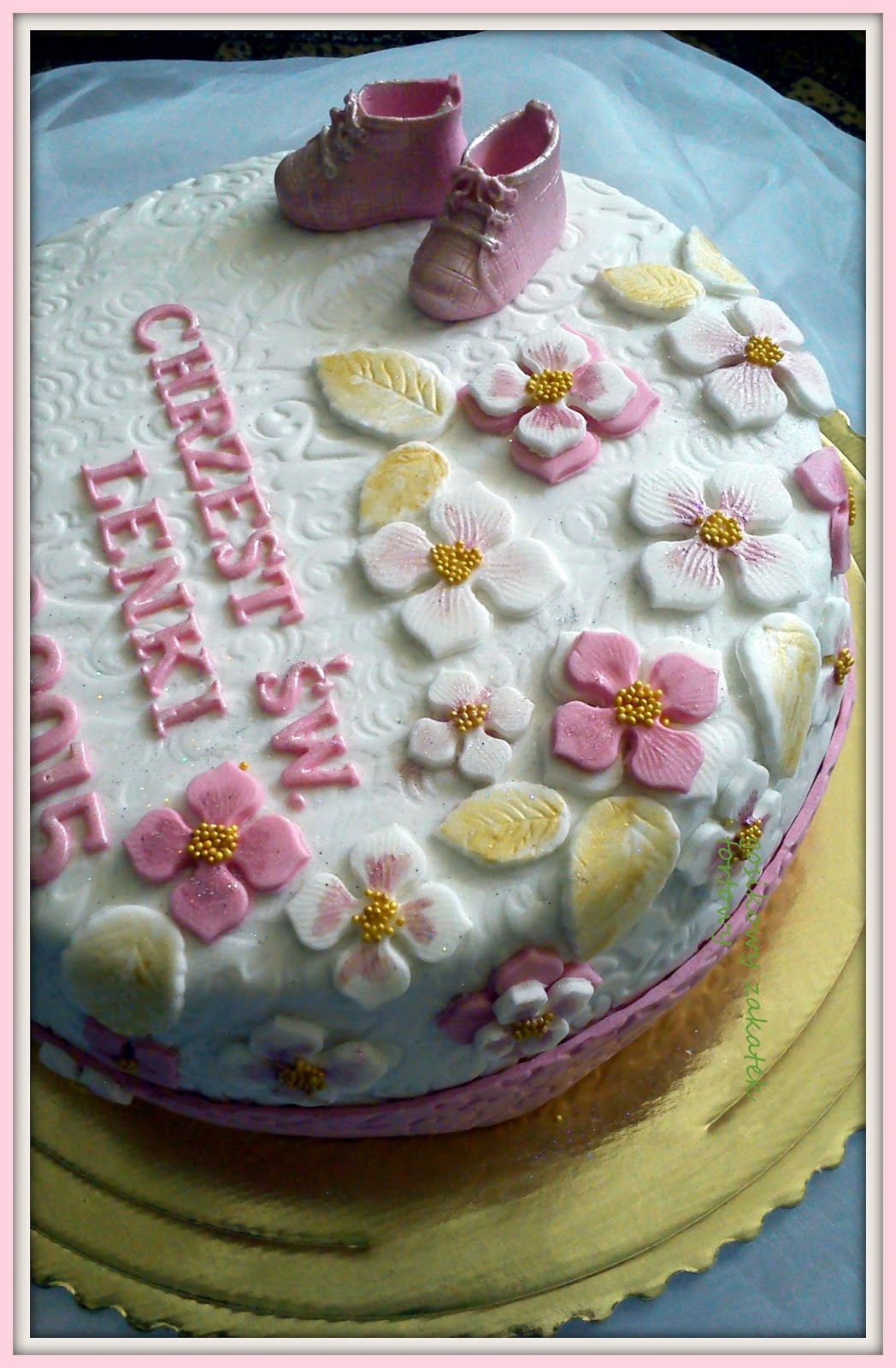 Uff, jak gorąco! Wpadam na chwilkę, aby pokazać Wam tort, który upiekłam z okazji chrztu małej dziewczynki. Jest taki upał, że masa cukrowa się topi i nie chce współpracować. Ale jakoś dałam radę.